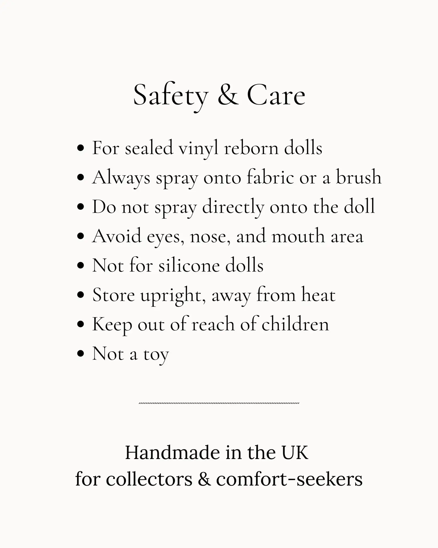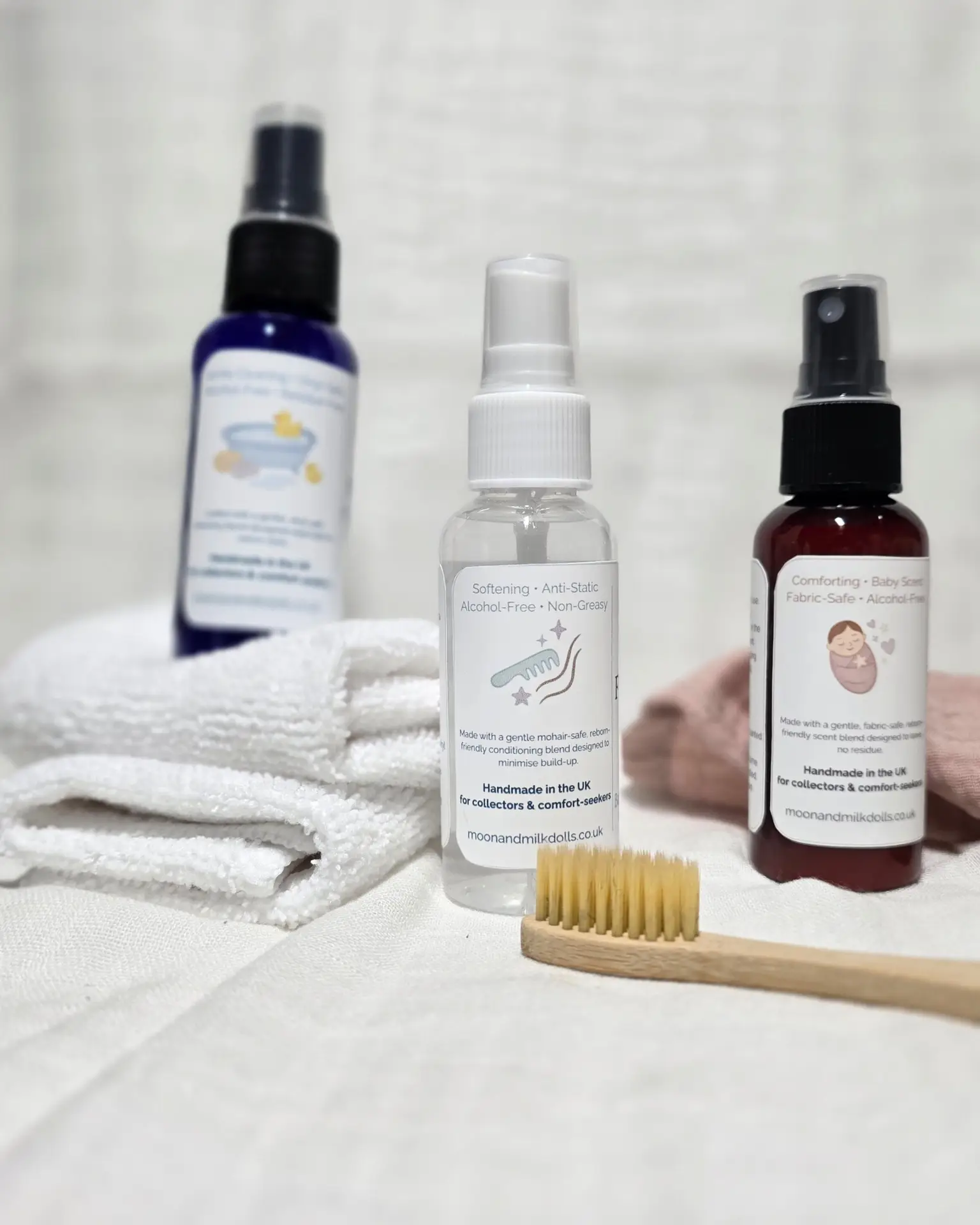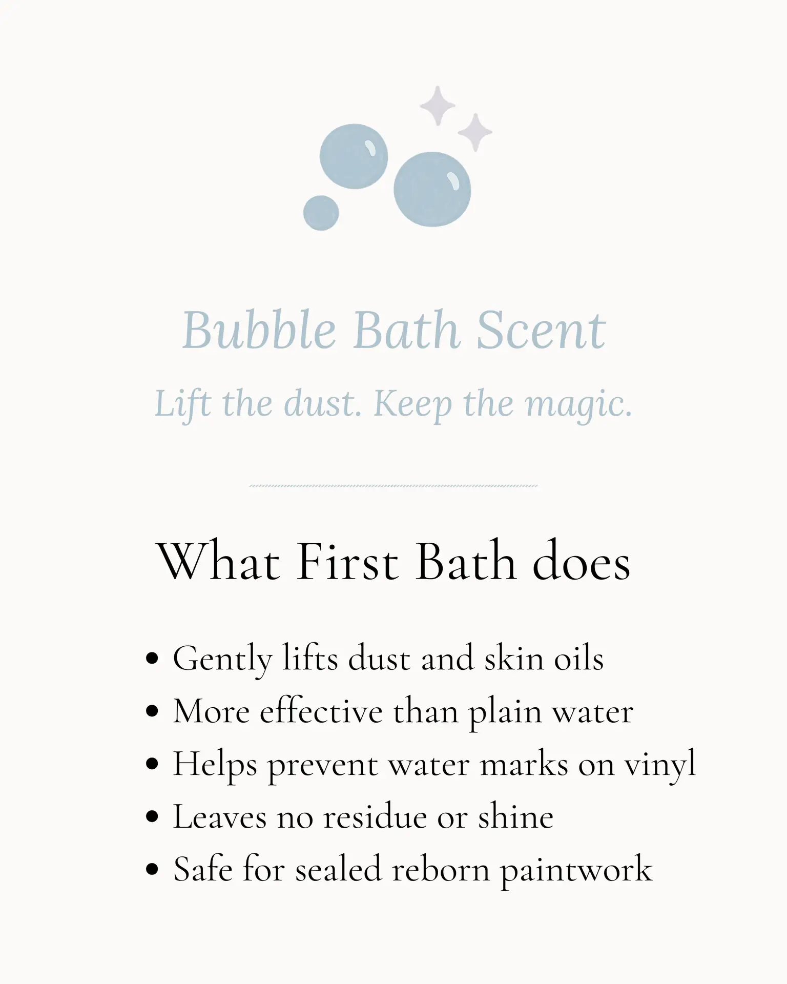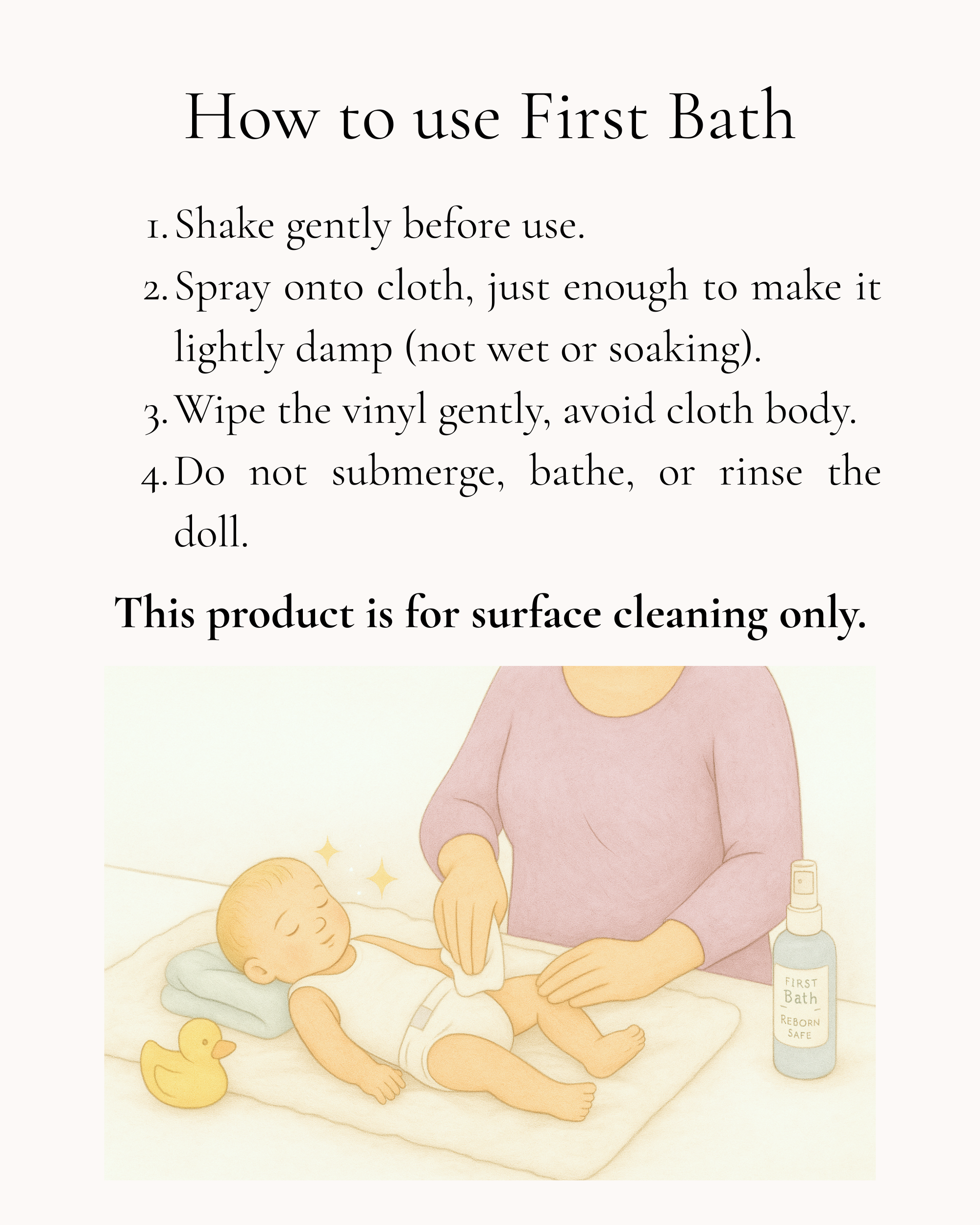 a gentle, predictable cleaning spray made specifically for sealed reborn vinyl, using cosmetic-grade ingredients and conservation-inspired methods.