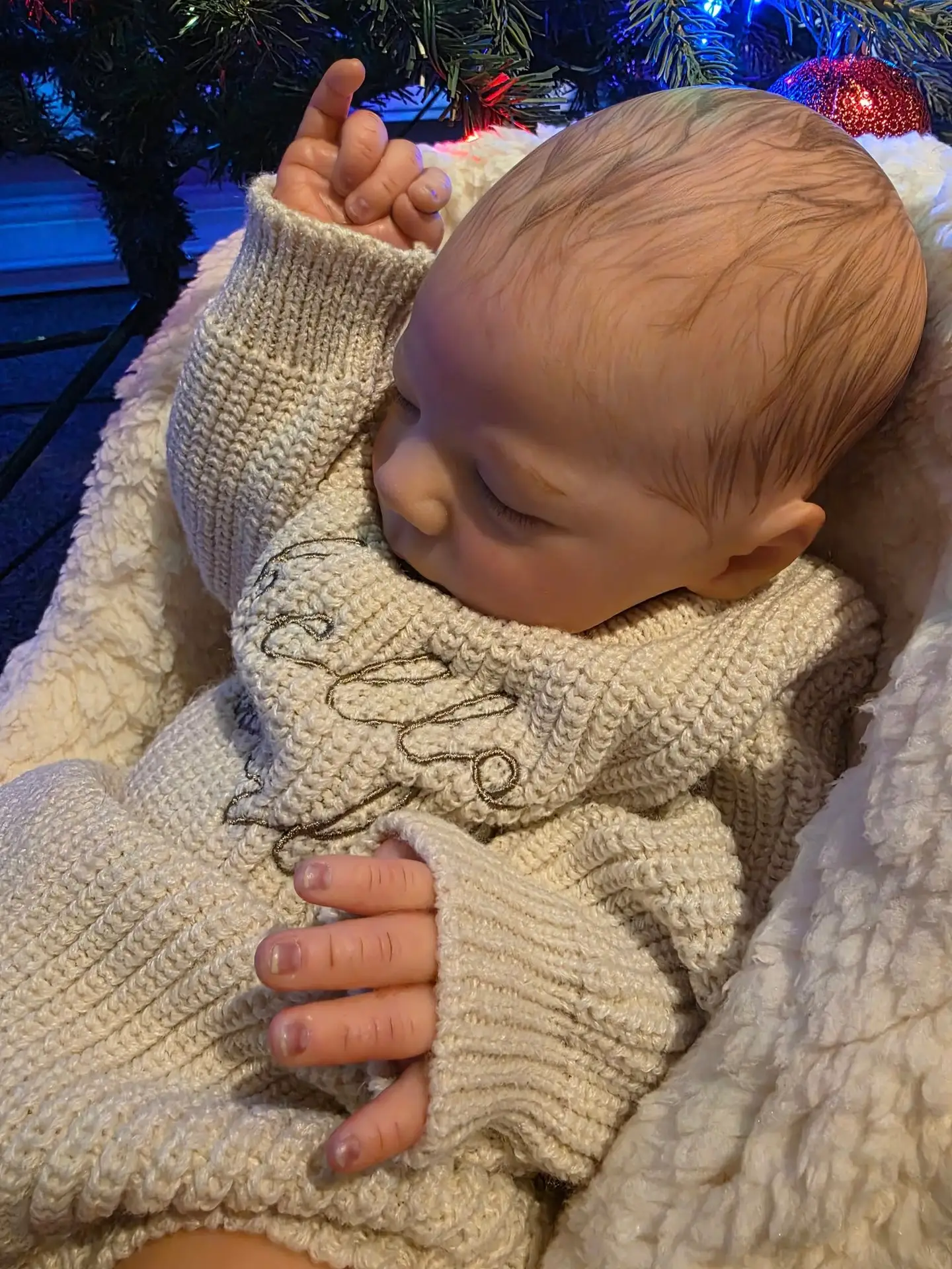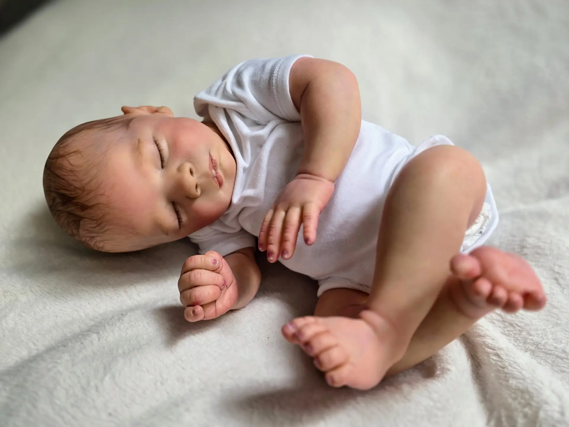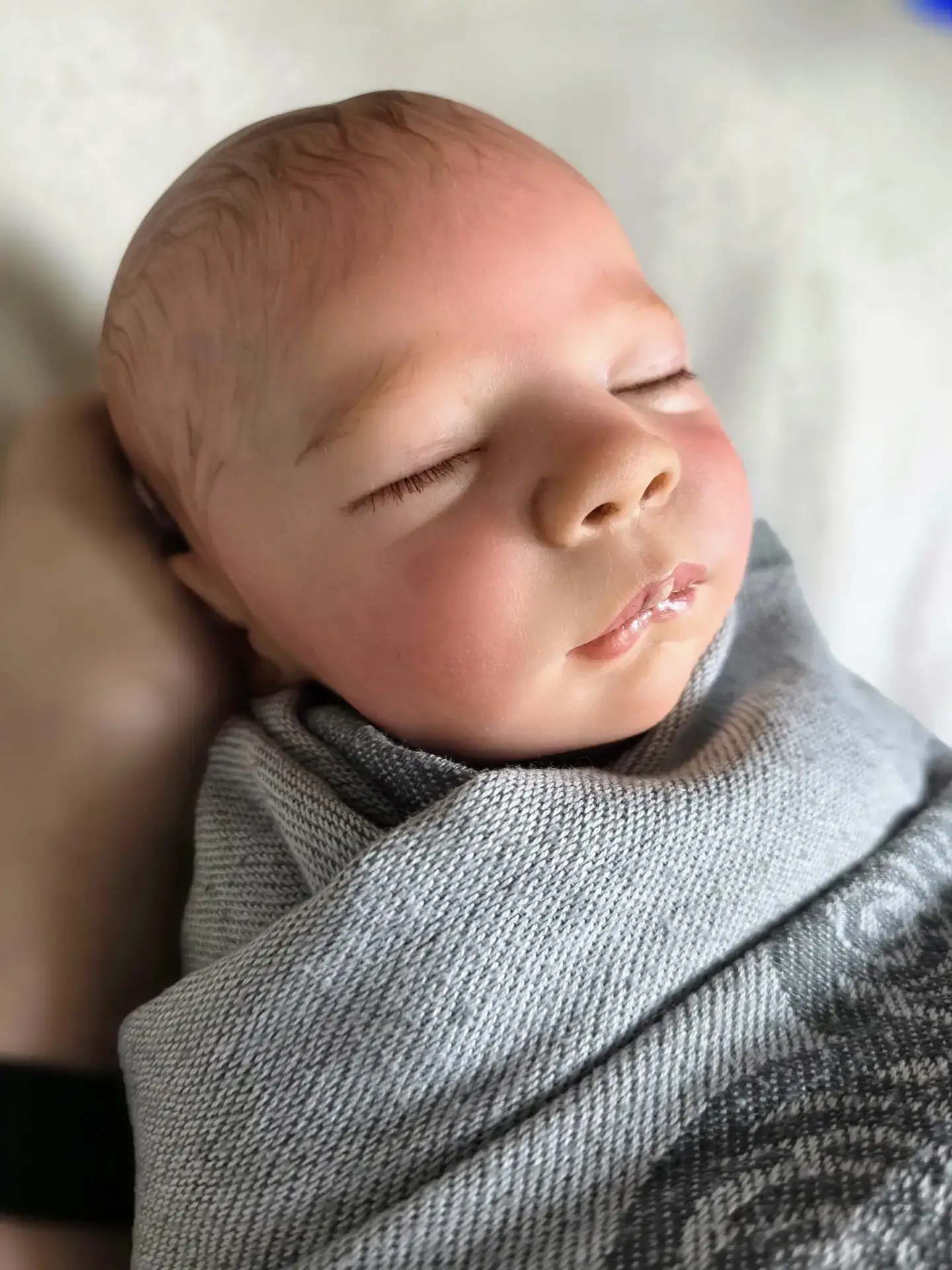 Realborn Dominic Asleep — a true-to-life sculpt created from 3D scans of a real baby. Measuring 19.5 inches and weighing 5 lb 9 oz, he’s meticulously weighted to real newborn proportions so his head and limbs move naturally in your arms.