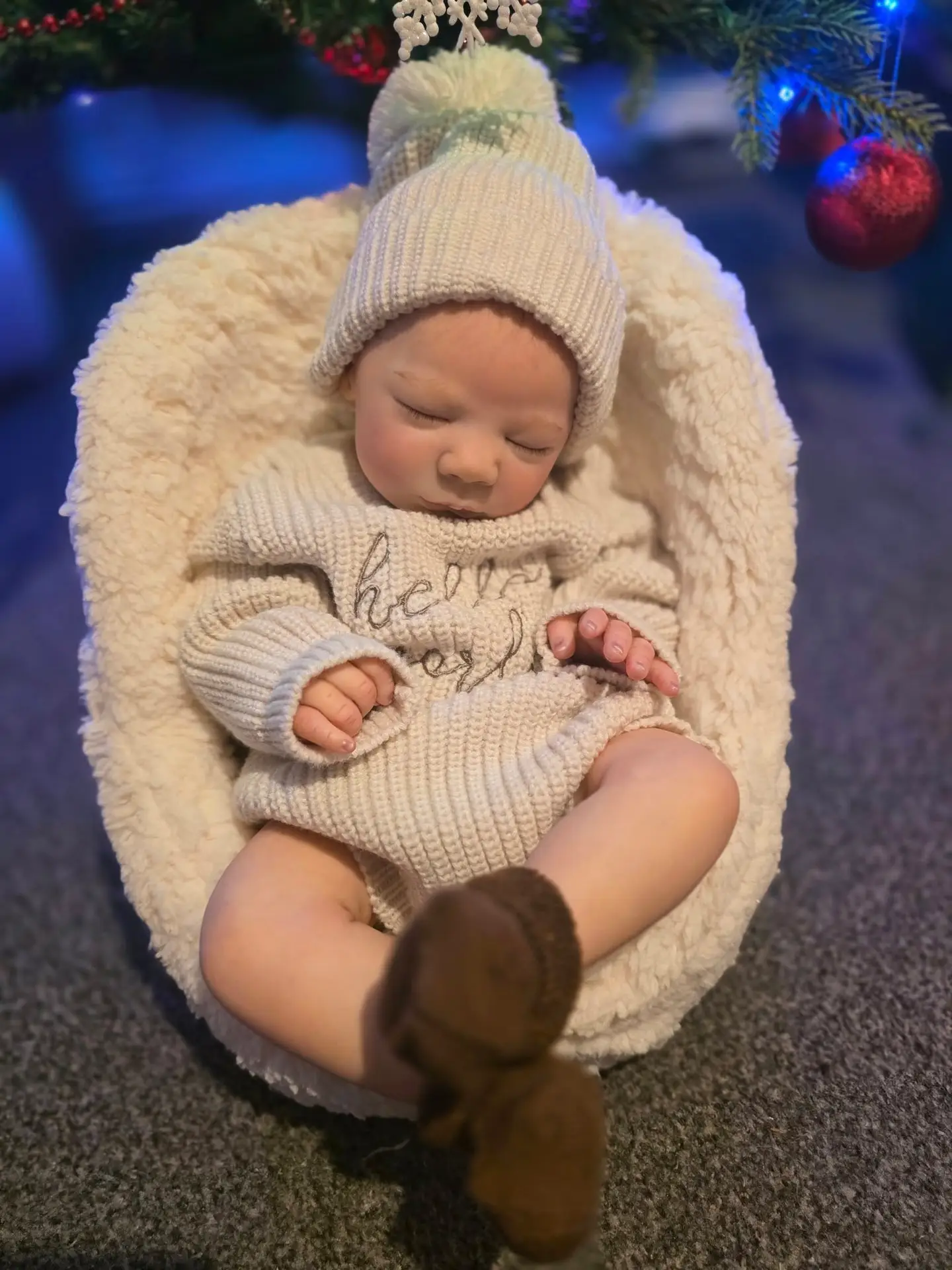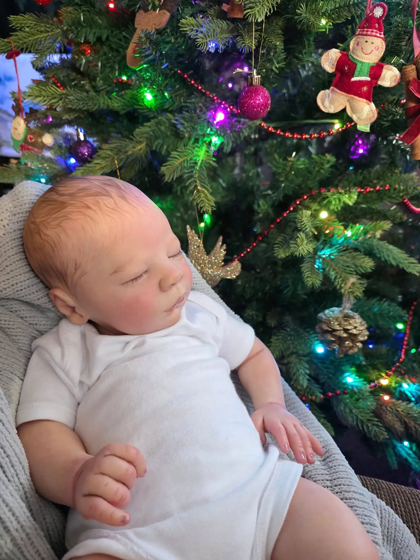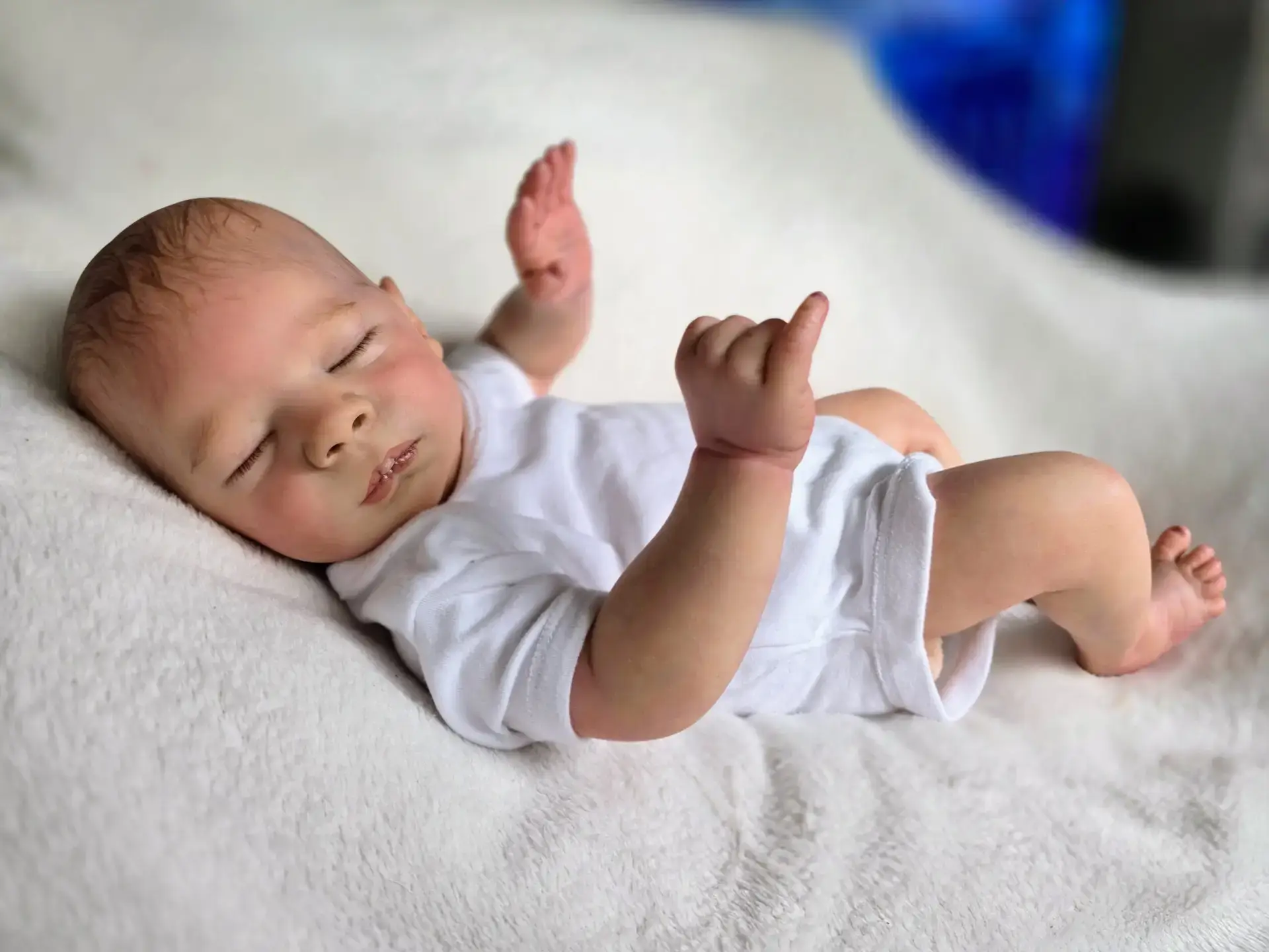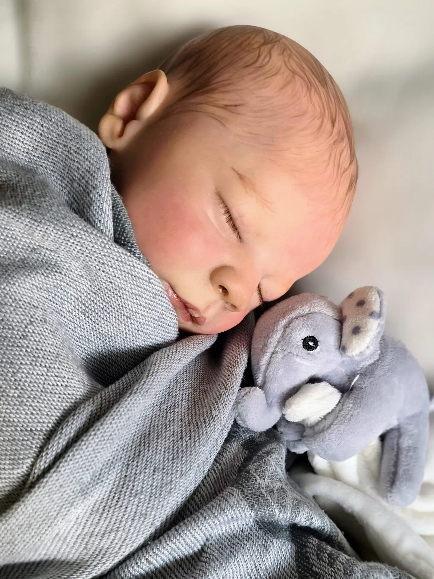 Realborn Dominic Asleep — a true-to-life sculpt created from 3D scans of a real baby. Measuring 19.5 inches and weighing 5 lb 9 oz, he’s meticulously weighted to real newborn proportions so his head and limbs move naturally in your arms.